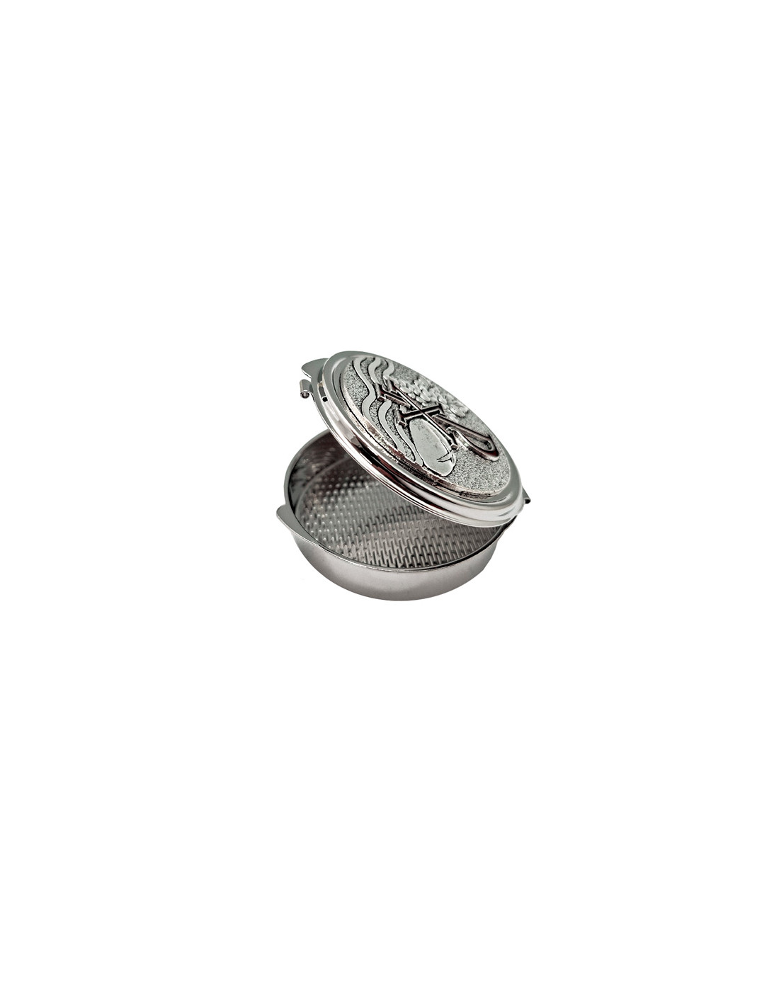 Portaviatico Caja Niquel Rodio Placa Relieve Plateada Pax Esmalte Rojo con Uvas y pan 6.2x2 cm