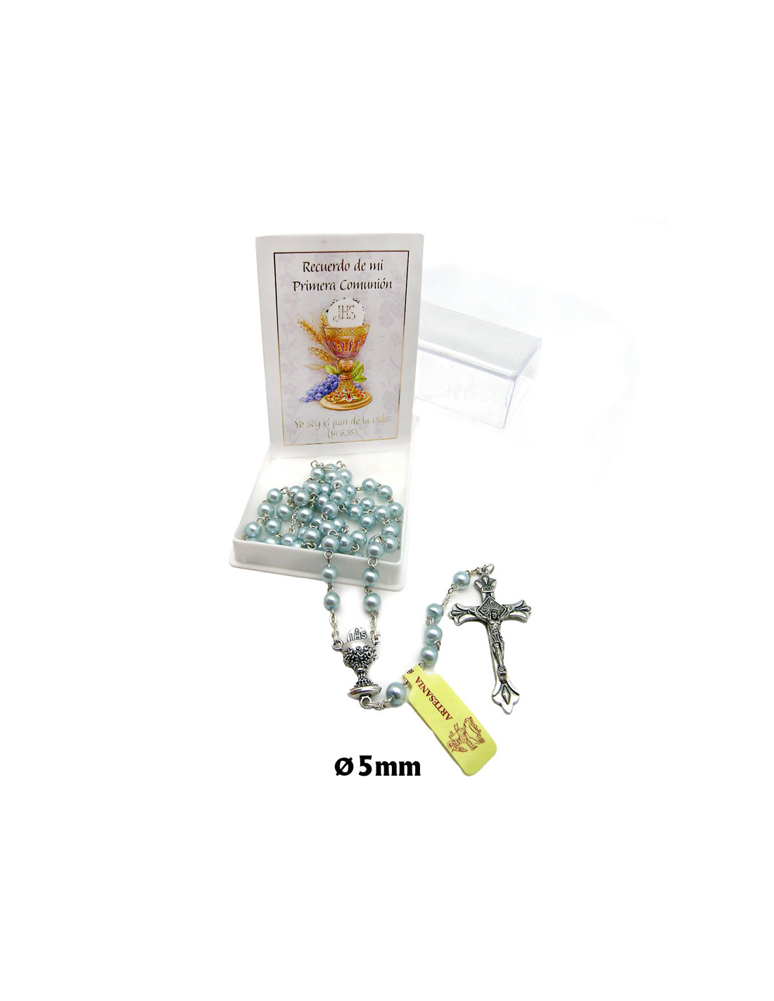 Rosario Cristal Perlado Celeste 5mm Primera Comunion Con Folleto En Caja