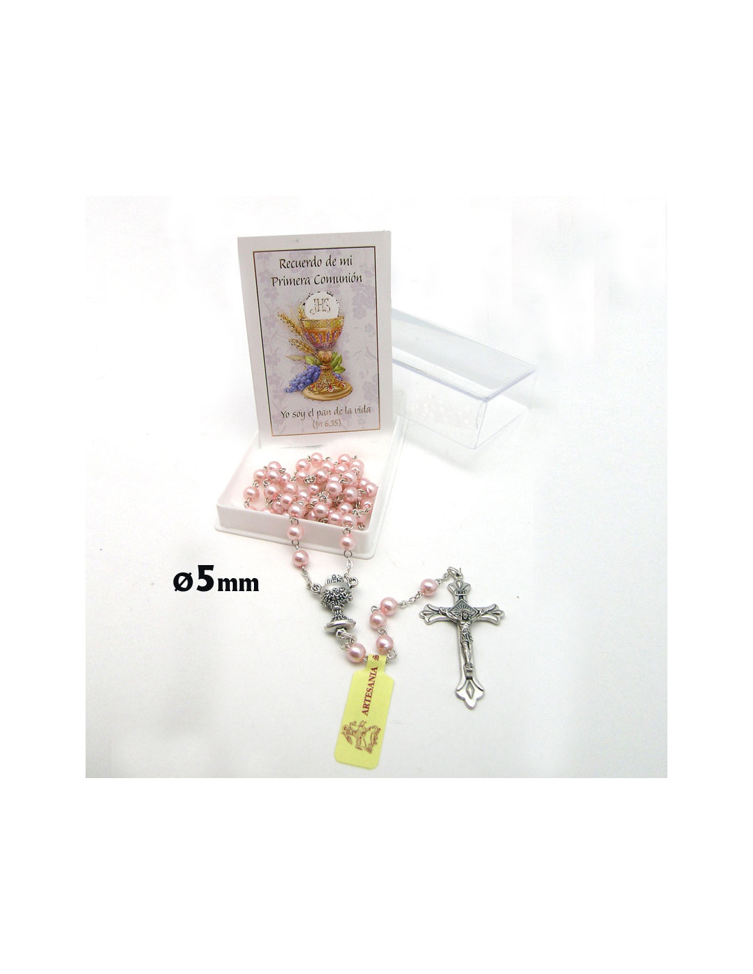 Rosario Cristal Perlado Rosa 5Mm Primera Comunion Con Folleto En Caja