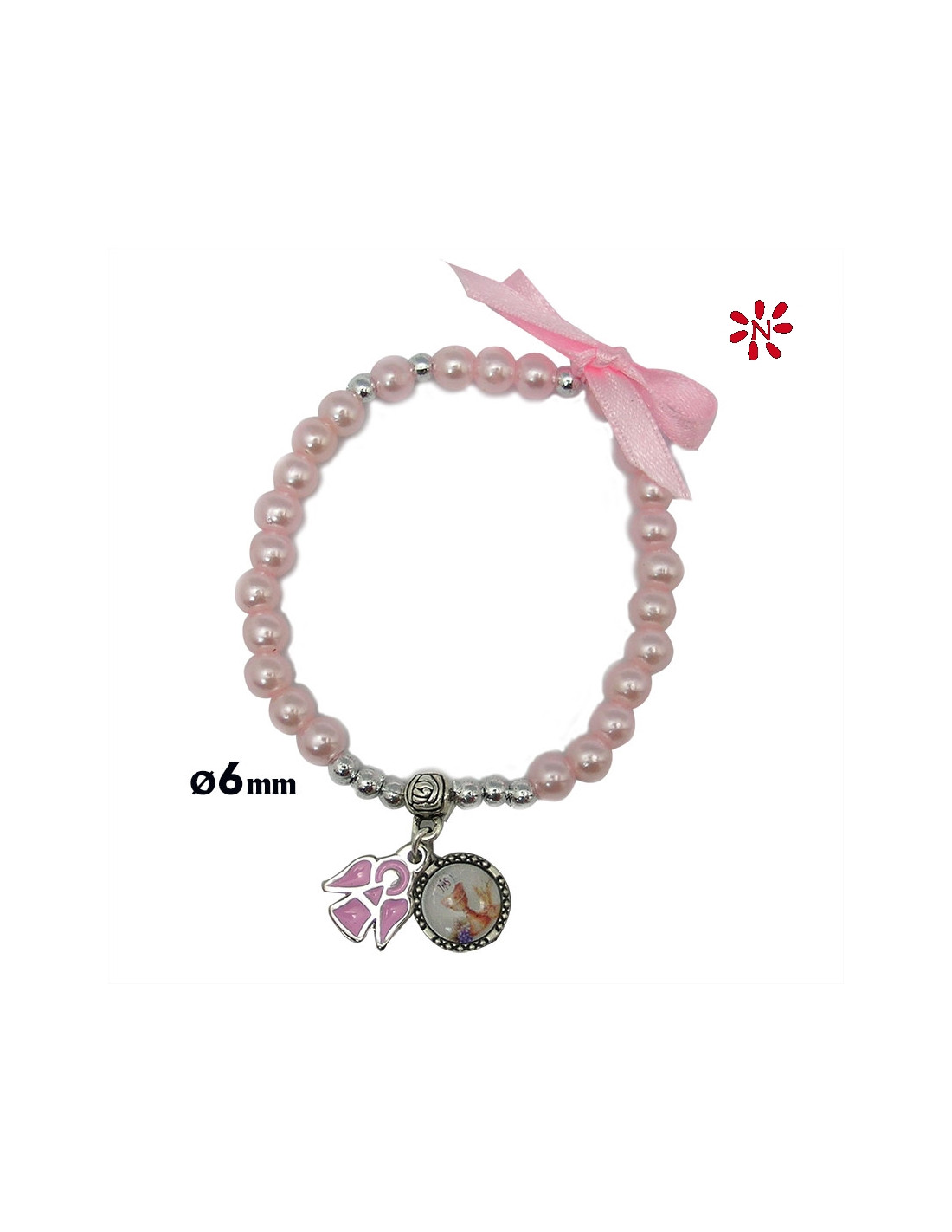 Pulsera Perlas Rosas 6Mm Primera Comunion Con Lazo Y Angel Esmaltado
