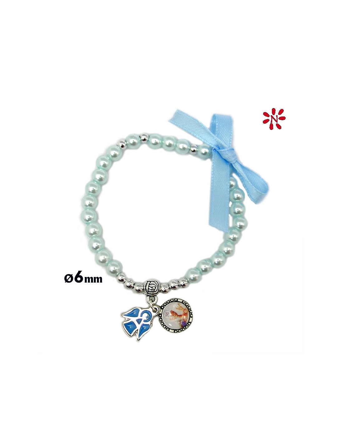 Pulsera Perlas Celestes 6Mm Primera Comunion Con Lazo Y Angel Esmaltado