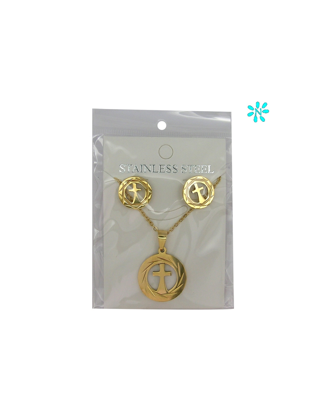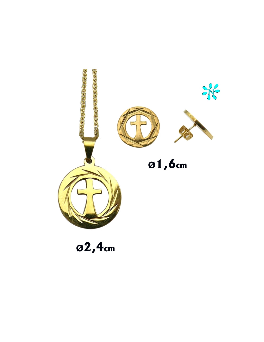 Juego Colgante Redondo 2. 4 Cm Y Pendientes Acero Dorado Disco Borde Rayado Y Cruz Interna