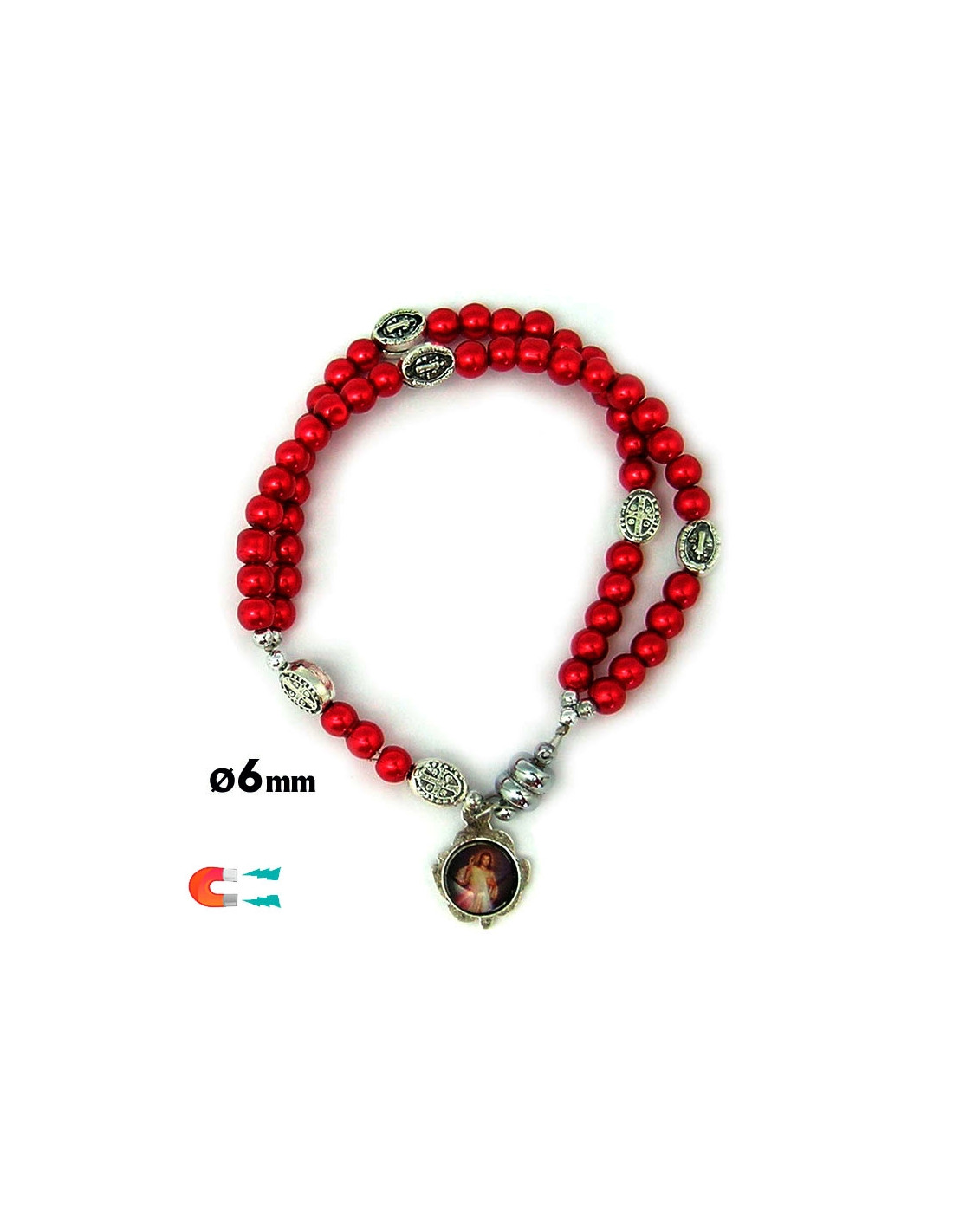 Pulsera Rosario Cristal Liso Rojo 5Mm Paters Medalla San Benito Cierre Magnetico