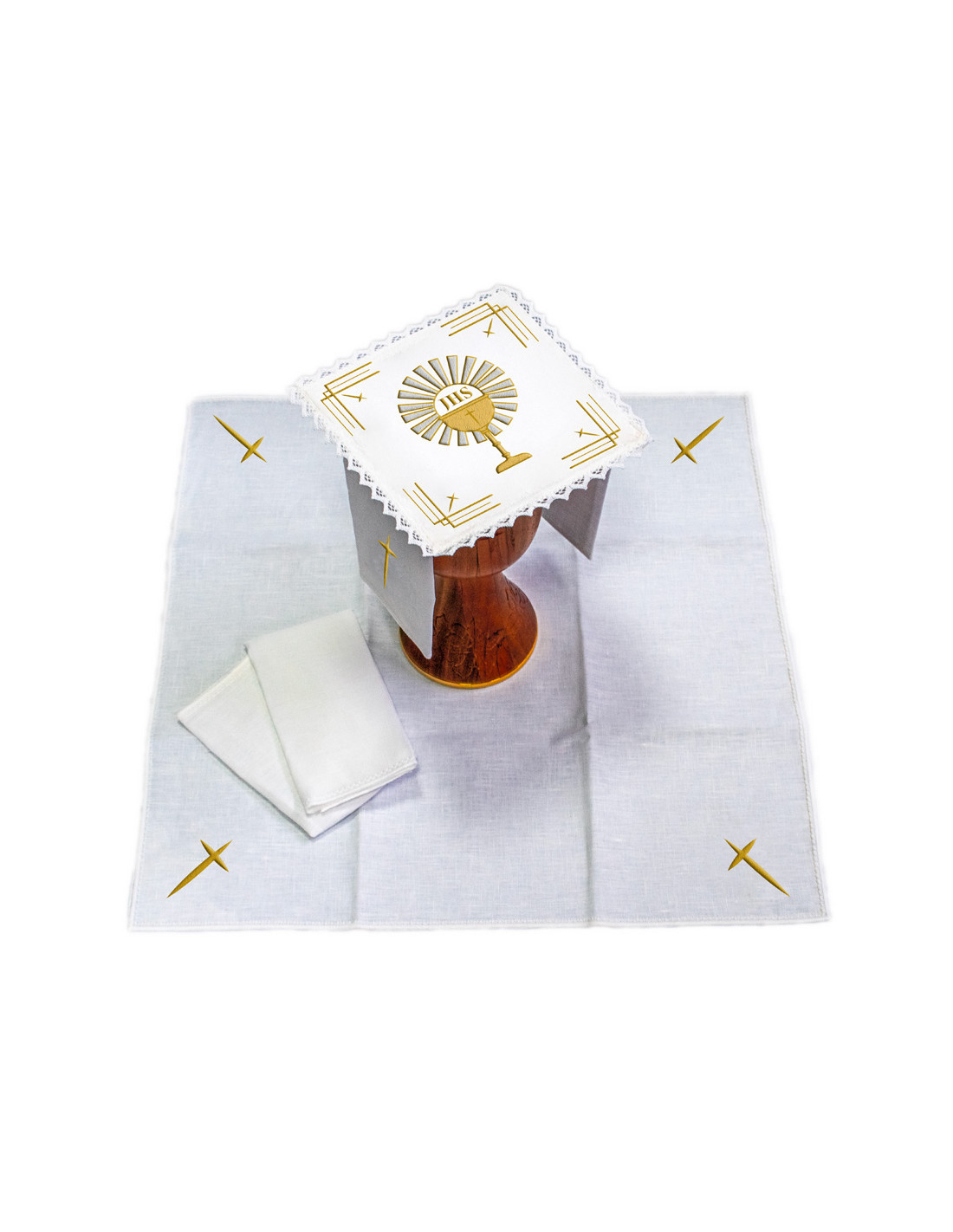 Juego De Altar Lino Bordado Caliz Sdm15 Con Forma Jhs Y Rayos